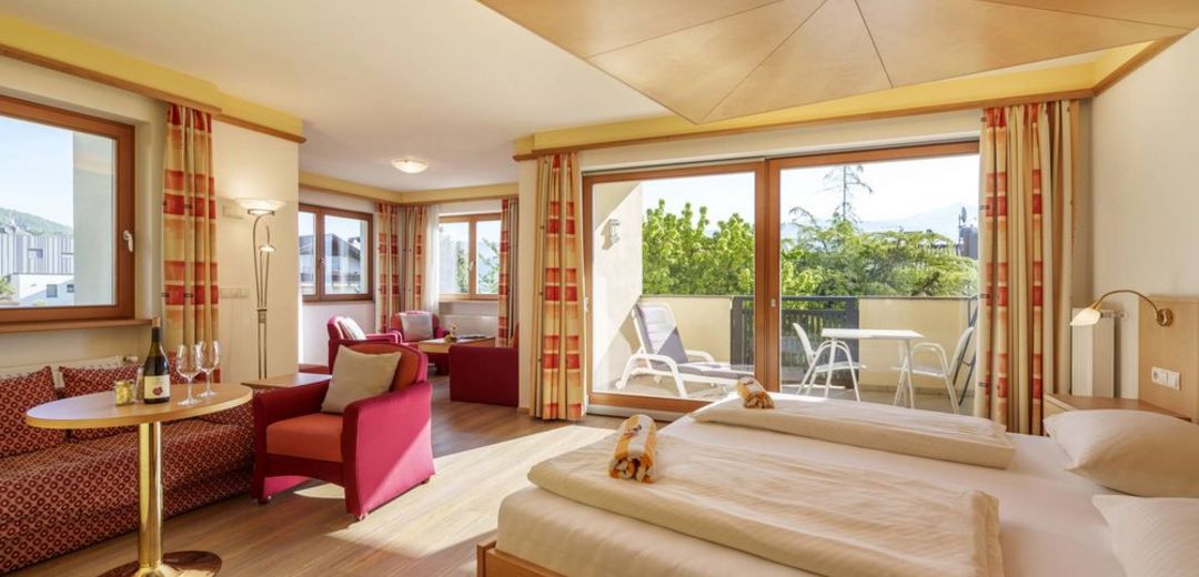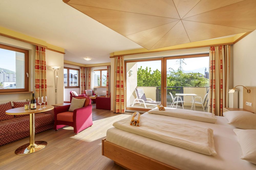 Le nostre nuove junior suite al terzo piano sono eleganti e accoglienti, ma niente paura: l’ascensore vi consente di risparmiare le forze per partire alla conquista delle cime! Il panorama è altrettanto incantevole, affacciato sulla valle costellata di vigneti e frutteti, dalle cime fino al Lago di Caldaro!
